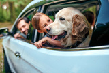 A cute little girl child with her friend dog labrador and parents go to the weekend cheerfully looking out of the car window. Leisure, travel, tourism.
