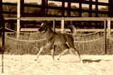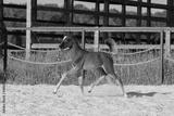Young pretty arabian horse foal runs and frolics summer background