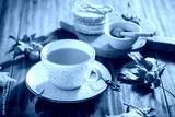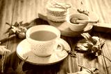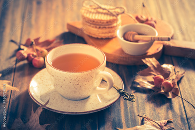 Hot tea with honey, homemade wafer biscuit and autumn leaves