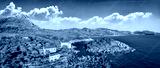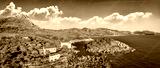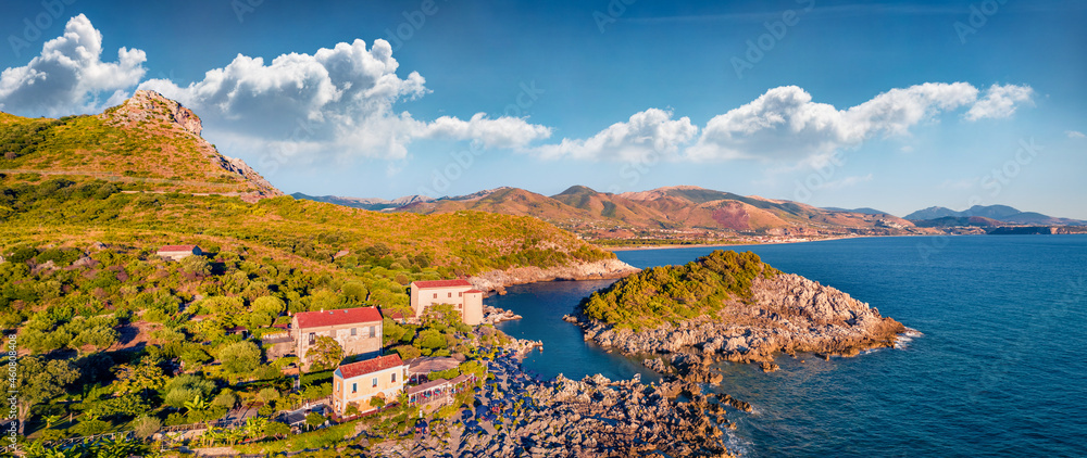Panoramic evening view from flying drone of scenic spot - La Secca, Maratea Castrocucco location, Italy, Europe. Attractive summer seascape of Mediterranean sea. Traveling concept background.