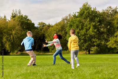 childhood, leisure and people concept - group of happy children playing tag game and running at park