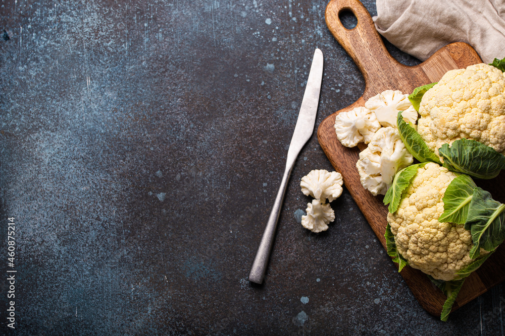 Fresh raw cut cauliflower with knife copy space