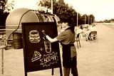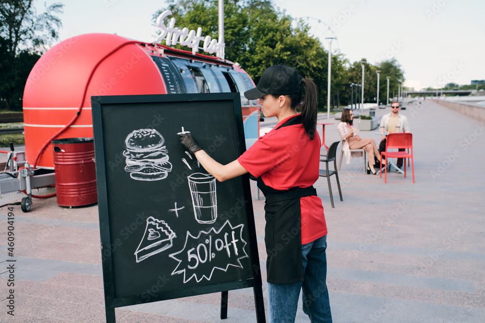 Young businesswoman drawing picture of fast food and drink on discount on blackboard