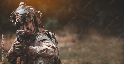 Soldier woman action with gun on hand holding to protect, survey around safety area in soldier mission with white smoke background..