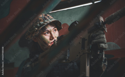 Soldier woman action with gun on hand holding to protect, survey around safety area in soldier mission with white smoke background..