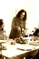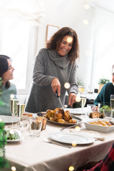 Smiling caucasian mature woman carving Christmas roasted chicken. Family gathering. Vertical image.