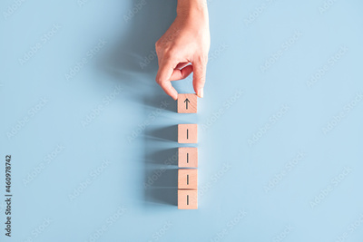Woman hand holding arrow going up on blue background, success and achievement, copy space.