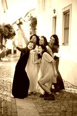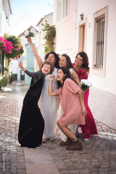 Cheerful guests and brides taking selfie. Women of different nationalities in festive dresses standing together, looking at mobile phone. Shouting cheerfully. Wedding, LGBT, celebration concept