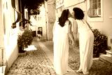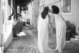 Happy brides going down street. Back view of two women in white dresses holding hands and kissing tenderly. Wedding, LGBT, celebration concept