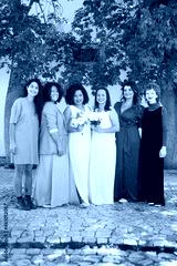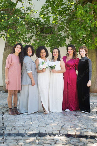 Portrait of beaming brides and guests at wedding. Women of different nationalities in festive dresses standing together and looking at camera. Wedding, LGBT, celebration concept