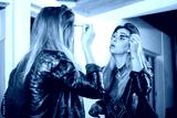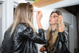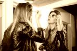 Beautiful young woman getting ready for party. Side view of long-haired woman applying mascara. Party, celebration, makeup concept