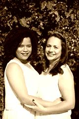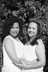 Portrait of joyful married women. Two women in white dresses looking at camera, smiling. Wedding, LGBT, celebration concept