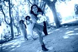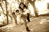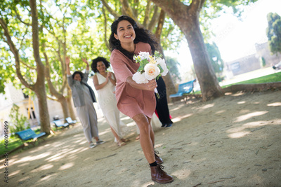 Smiling young woman catching wedding bouquet. Dark haired woman in pink dress with flowers. Women of different nationalities in festive dresses laughing in background. LGBT wedding celebration concept
