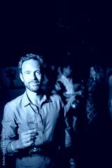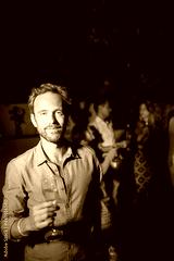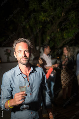 Portrait of young bearded man with champagne glass at party. Caucasian man in casual clothes looking at camera. People of different nationalities standing in background. Nightlife, home party concept
