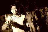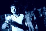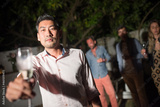 Young man with champagne flute at party. Asian male in casual clothes showing glass at camera. People of different nationalities standing in background. Nightlife, home party concept