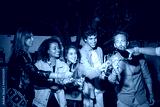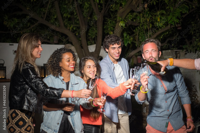 Young people drinking champagne at party. Woman pouring beverage in glasses. People smiling. Party, celebration, nightlife concept