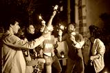 Young men and women partying at backyard. Group of males and females of different nationalities holding beer bottles, lighting sparklers. Party, celebration, nightlife concept