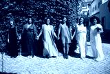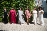 Brides and guests holding hands. Women of different nationalities in festive dresses standing together, looking at camera, smiling. Wedding, LGBT, celebration concept
