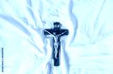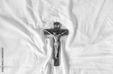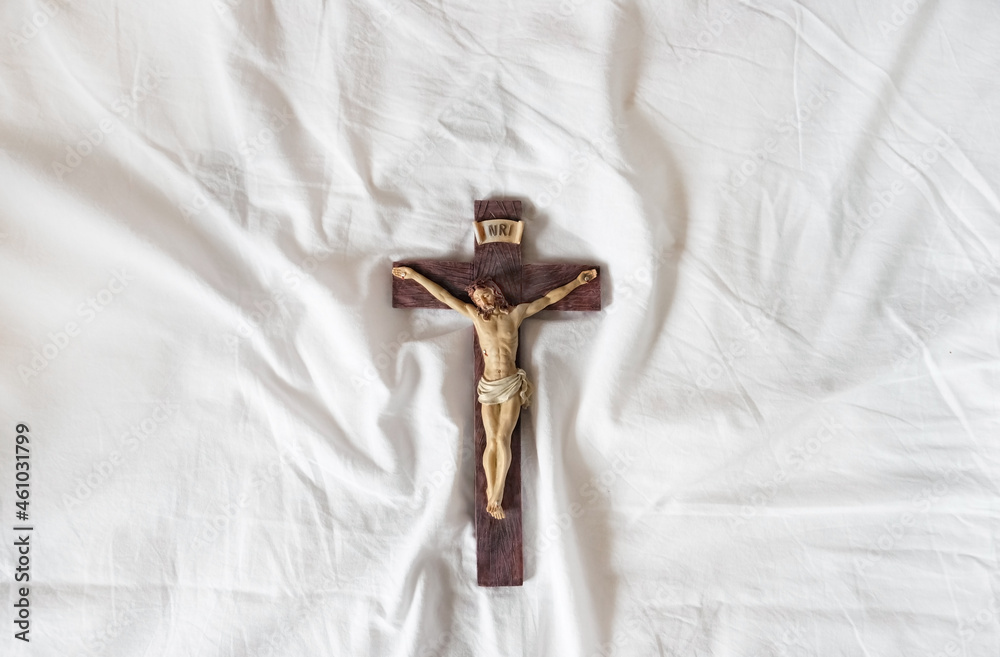 christian crucifix on abstract white fabric background. spiritual symbol of Lent. Orthodox, Catholic, Protestant religion, faith in God, Church holiday concept. flat lay