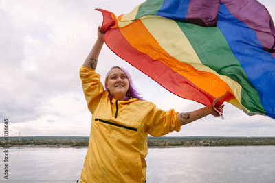 happy young woman lesbian holding lgbtq pride flag