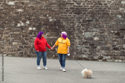 two color hair lesbian with small dog holding hands at stone wall background city street