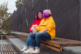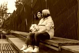two color hair lesbian woman sitting on bench outdoor, holding cute dog spitz