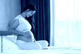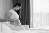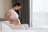 Happy Pregnant Asian Woman sitting on bed holding and stroking her big belly at home,Pregnancy of young woman enjoying with future life relax at home,Motherhood and Pregnant Concept,Soft focus
