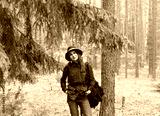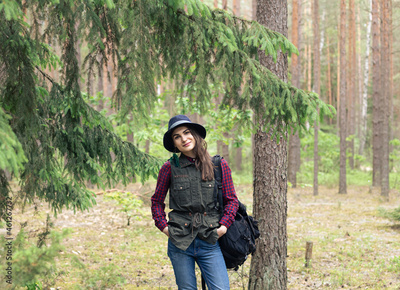 Happy young woman in a hat standing and smiling into camera while traveling in forest and exploring local nature