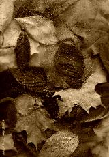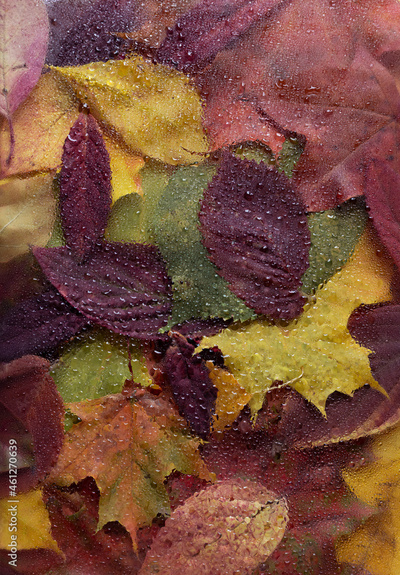 Autumn or Fall colorful leaves behind wet glass. Seasonal abstract composition