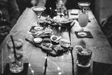 Blurred background of multicolored drinks and minimal food - Happy hour concept with fancy cocktails and tasty appetizers served at rooftop lounge prive - Warm vintage filter on shallow depth of field