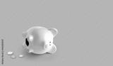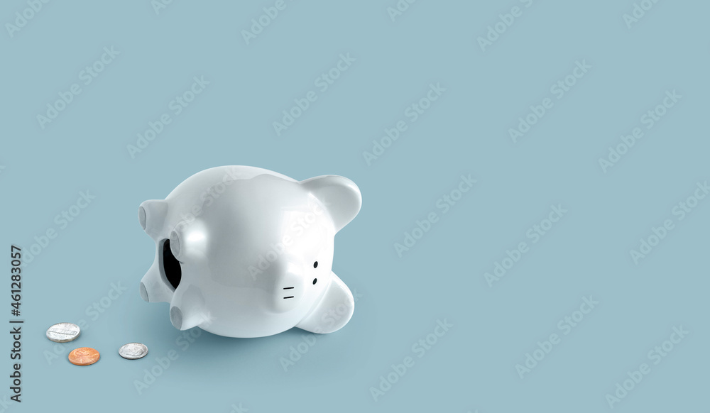 fallen piggy bank with US coins coming out, white piggy with blue background bottom left corner