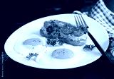 Fried eggs and a grilled chicken pate sandwich on a dark background.