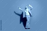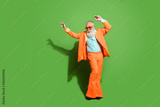 Full length body size view of attractive elegant grey-haired man dancing wearing specs isolated over bright green color background
