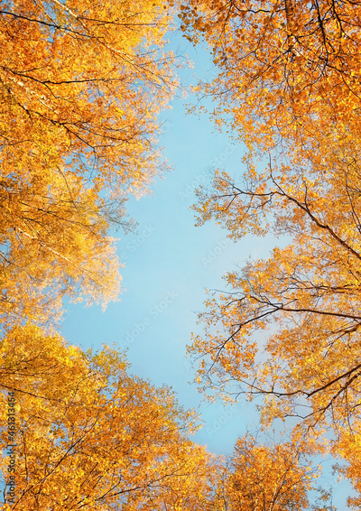 autumn yellow trees against blue sky. Indian summer, Autumnal last warm season. beautiful golden Fall. copy space