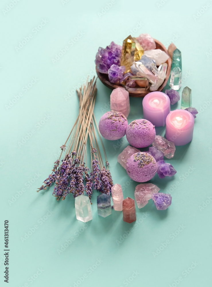 gemstones minerals, candles, lavender flowers, bath bombs on green background. Crystal ritual, Esoteric spiritual practice for harmony soul, aura cleansing. self care and spa. relax time.