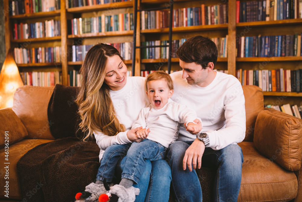 Christmas family portrait. Young Caucasian family in identical clothes having fun on sofa in living room with large library of books and Christmas tree in evening. Happy New Year and Merry Christmas