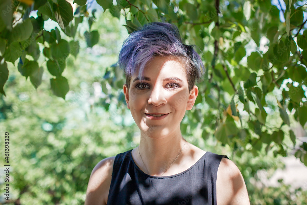 Stylish millennial girl with purple colored hair wearing little black dress at the school yard during graduation party, generation Z, fashion and diversity, girl power, outdoor lifestyle