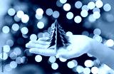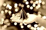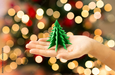 winter holidays, new year and celebration concept - close up of hand holding green paper origami christmas tree over bokeh lights on background