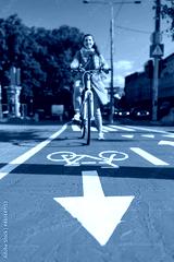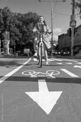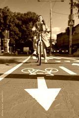 traffic, city transport and people concept - woman cycling along red bike lane with signs of bicycles on street