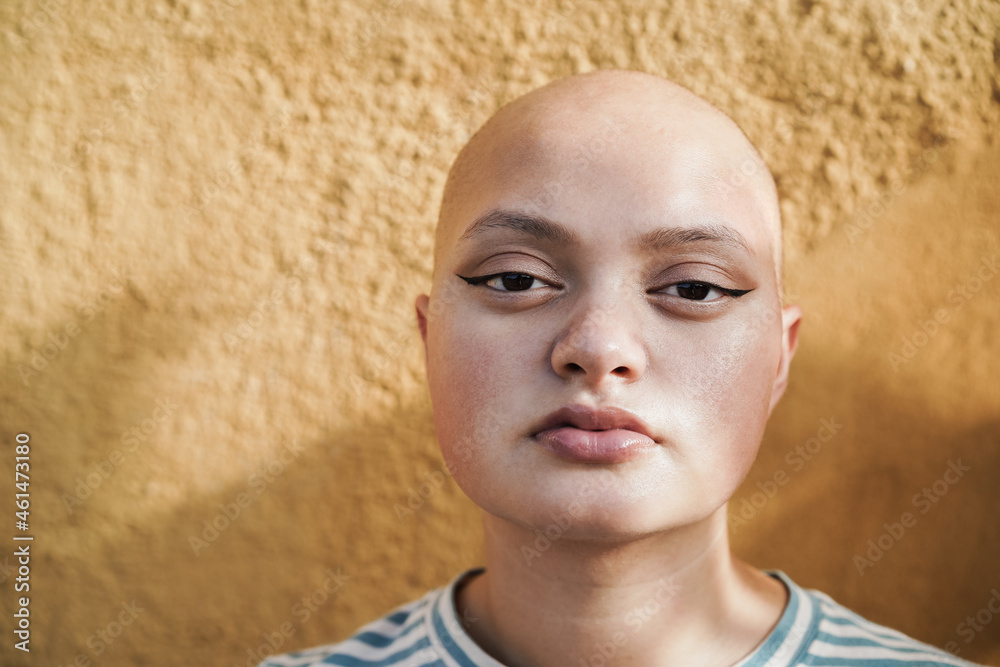 Bald girl posing in front of camera with yellow background - Focus on eyes