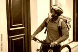 African delivery man with electric bike ringing the doorbell during coronavirus time - Focus on face