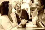 Multiracial senior women having fun playing guessing forehead game at bar restaurant - Focus on african woman face