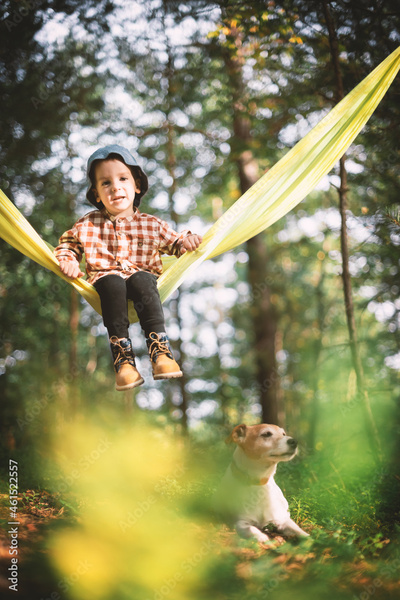 Small kid in yellow hammock with white dog puppy breed jack russel terrier in autumn forest. Childhood with pets concept