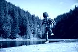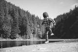 Small kid in a plaid shirt and gray hat on the forest lake coast. Childhood with nature loving concept