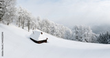 Fantastic winter panoramical landscape with wooden cabin in snowy forest. Cozy house in Carpathian mountains. Christmas holiday concept