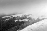 Amazing scene on autumn mountains. First snow and orange trees in fantastic morning fog. Carpathians, Europe. Landscape photography