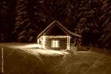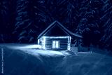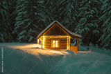 Fantastic winter landscape with glowing wooden cabin in snowy forest. Cozy house in Carpathian mountains. Christmas holiday concept