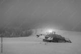 Ratrak in action on the morning ski slope. Machine for skiing slope preparations with headlights on in snowy mountains