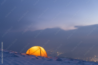 Yellow tent lighted from the inside against the backdrop of glowing city lights in fog. Amazing snowy landscape. Tourists camp in winter mountains. Travel concept