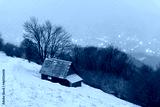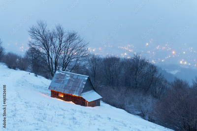 Fantastic winter landscape with glowing wooden house against the backdrop of glowing city lights in fog. Cozy cabin in Carpathian mountains. Christmas holiday concept